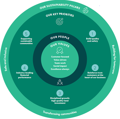 We build homes for the future in sustainable communities. We uphold the highest safety standards and leave a legacy that delivers economic, social and environmental value to the communities we build in.
